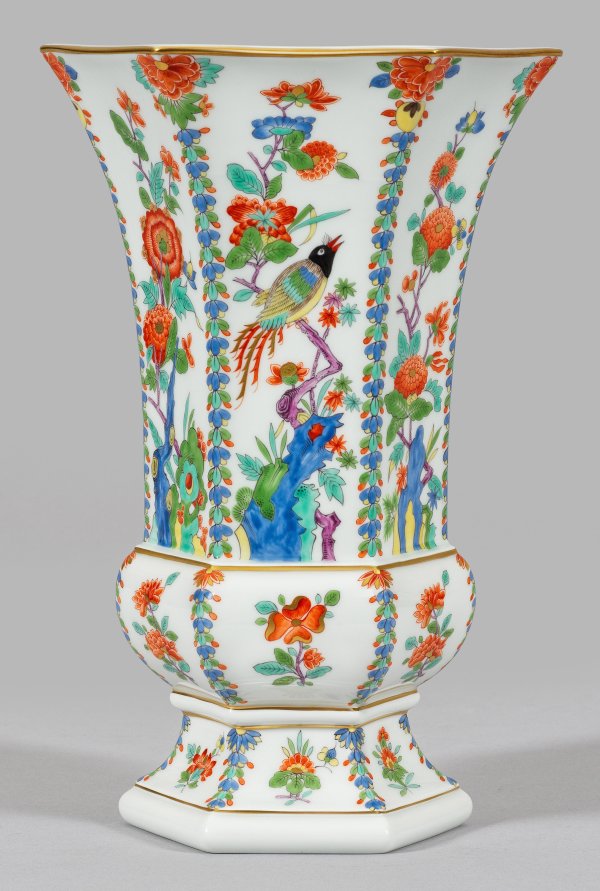 Sechskantig eingezogener, profilierter Fuß mit balusterförmig gewölbtem, in den passig gekanteten, trompetenförmig ausschwingenden Korpus übergehend. Allseits der Wandung alternierende, reiche Kakiemonmalerei mit blühenden Chrysanthemenstauden aus einem Fels bzw. einer Hecke mit Reisigbündeln emporsteigend und darin sitzenden Vögeln. Feine polychrome Malerei von Inge Schubert. Goldrand. Maler-Sign. "I. Schubert". Modell-Nr. 50041. Jahreszeichen. H. 27,5 cm.