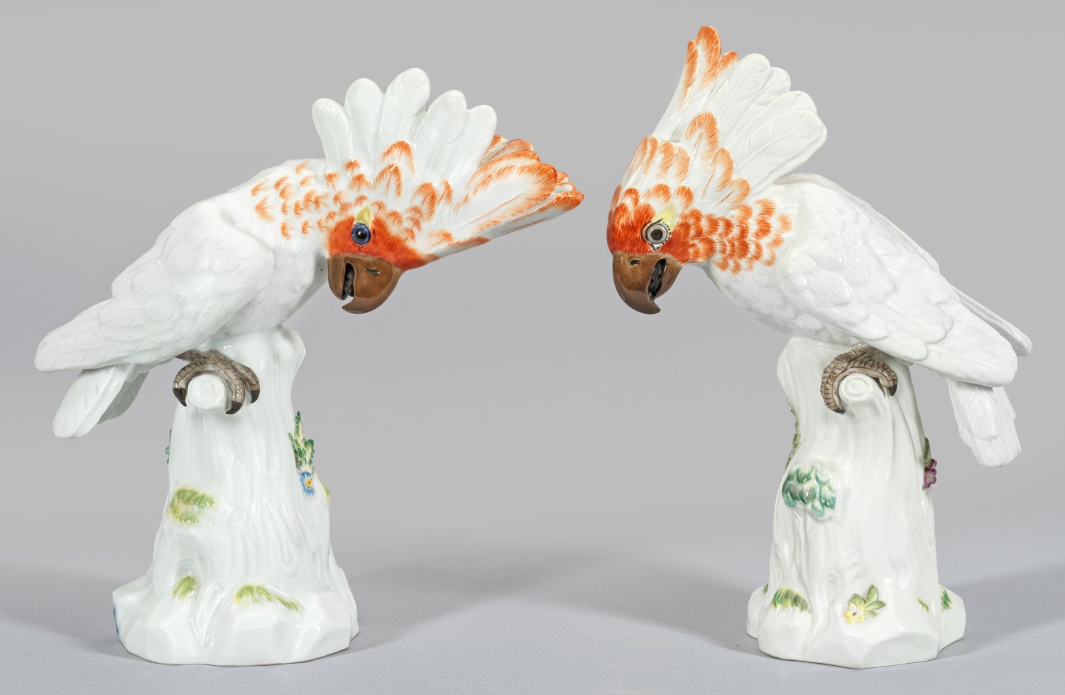 Auf hohem Baumsockel sitzender, naturalistisch gestalteter Kakadu mit fein reliefiertem Federkleid und farbenprächtiger Staffierung der Kopffedern in Eisenrot. Polychrome Malerei. Entw. Johann Joachim Kaendler und Johann Friedrich Eberlein. Modell-Nr. 57a und 57b. Teilw. minim. best.; Schwertermarke. H. 23,5 cm - 25 cm.