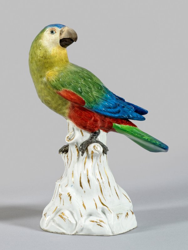 auf Stamm, den Kopf nach links gewandt. Reliefiertes, farbenprächtig in unterschiedlichen Grüntönen staffiertes, mit Blau und Rot akzentuiertes Gefieder. Polychrome Malerei. Entw. Johann Joachim Kaendler. Modell-Nr. 59 x. Best.; rest.; Haarriss. Schwertermarke. H. 22 cm.