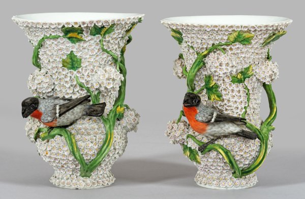 A pair of Schneeballen porcelain vases with Eurasian bullfinch. Partly chipped. Insignificantly restored. Crossed swords mark.