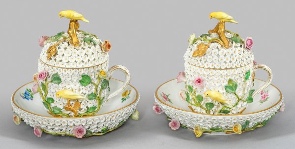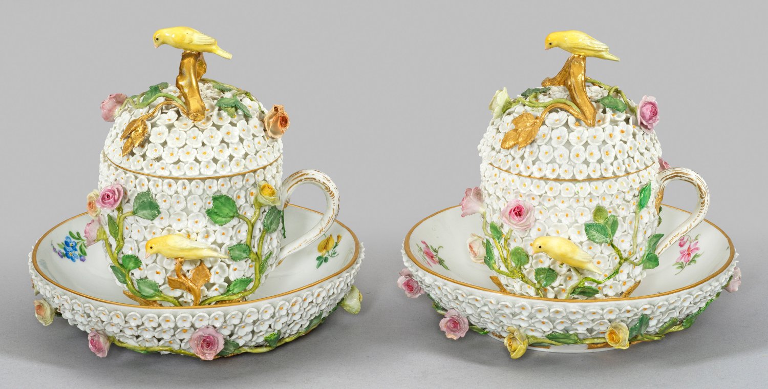 Auf Untertassen. Gemuldete Form mit Ohrenhenkel. Auf den Außenwandungen sog. Schneeballendekor aus flächendeckenden, aufbossierten, kleinen Blüten, umzogen von plastischen Blumen- und Blattranken, teilw. mit seitlich sitzenden Kanarienvögeln. Im Spiegel gestreute Blumen. Polychrome Malerei mit Goldstaffage. Entw. Johann Joachim Kaendler. Rest.; Schwertermarke. Gesamt-H. 13,5 cm. D. 14 cm.