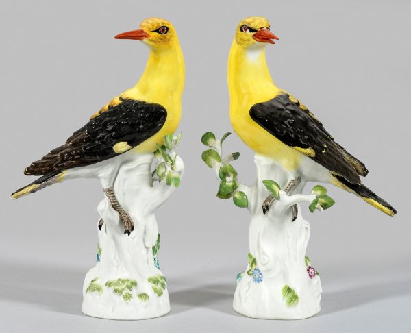 Auf hohem, mit plastischen Blättern belegtem Baumstamm sitzender Pirol mit angelegten bzw. ausgebreiteten Flügeln. Naturalistisches, in Gelb und Schwarz staffiertes, teilw. reliefiertes Gefieder. Polychrome Malerei. Entw. Johann Joachim Kaendler und Johann Gottlieb Ehder. Modell-Nr. 820 und 820x. Rest.; Schwertermarke. H. 26 cm.