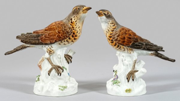 Auf hohem Felssockel mit Baumstumpf sitzende Singdrosseln mit reliefiertem, naturalistisch gezeichnetem Federkleid. Polychrome Malerei. Entw. Johann Joachim Kaendler. Modell-Nr. 649 und 1023. Teilw. rest.; Schwertermarke. H. 19 cm - 20 cm.