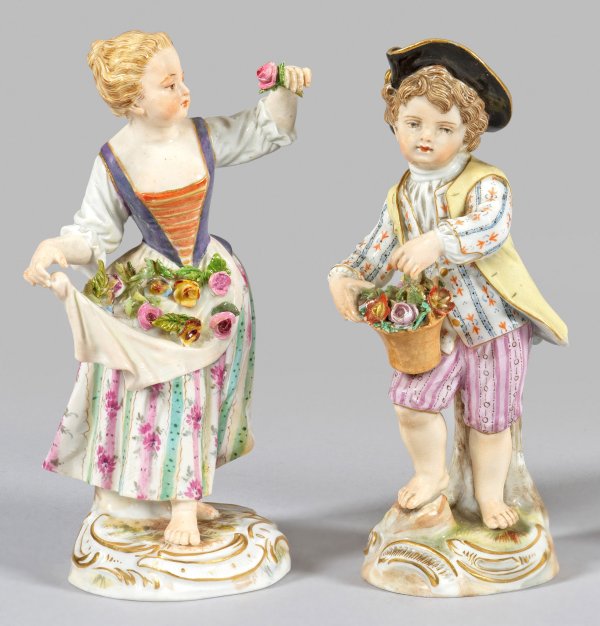 Auf rocaillereliefiertem Sockel stehender Knabe mit Blumenkorb bzw. Mädchen, mit der rechten Hand die blumengefüllte Schürze hochhebend, in der Linken einen Blütenzweig haltend. Polychrome Malerei mit Goldstaffage. Entw. Johann Joachim Kaendler. Modell-Nr. 9 und 9x. Rest.; teilw. besch.; Schwertermarke. H. 13,5 cm.