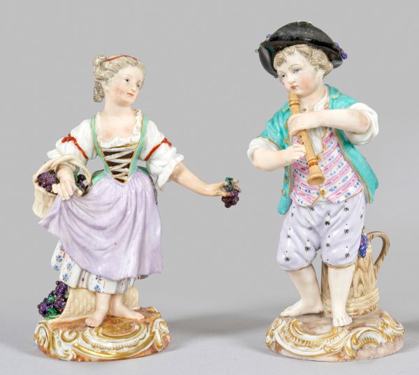 Auf rocaillereliefiertem Sockel stehendes Mädchen mit Trauben und ein Flöte spielender Knabe unweit einer mit Trauben gefüllten Kiepe. Polychrome Malerei mit Goldstaffage. Entw. Johann Joachim Kaendler. Modell-Nr. F 1. Rest./minim. best.; Schwertermarke. H. 12 cm - 13,5 cm.