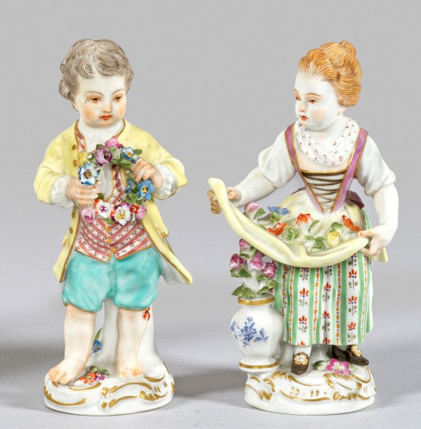 Auf rocaillereliefiertem Sockel stehender Knabe mit Blumenkranz bzw. Mädchen, mit beiden Händen die von Blumen gefüllte Schürze haltend. Polychrome Malerei mit Goldstaffage. Entw. Johann Joachim Kaendler. Modell-Nr. 6 und 6x. Minim. best.; Schwertermarke. H. 12,5 cm.