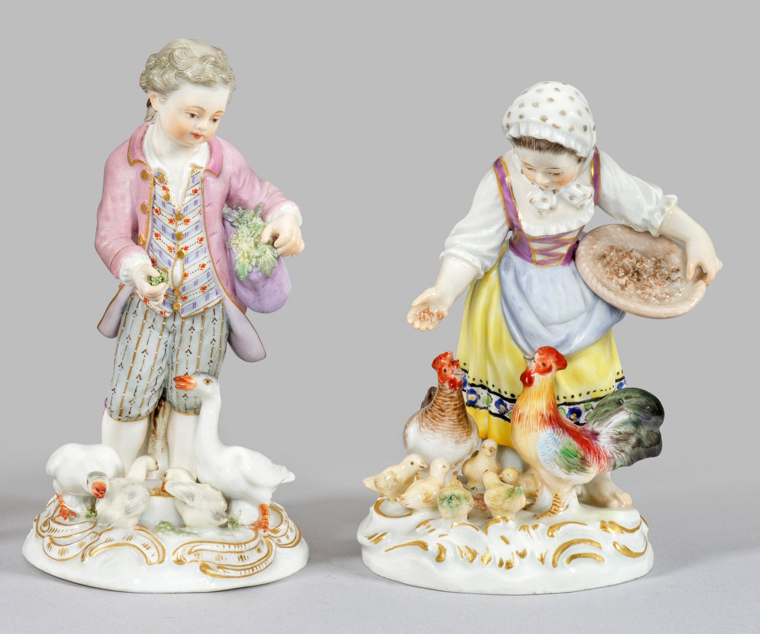 Auf rocaillereliefiertem Sockel stehender Knabe und stehendes Mädchen in sommerlicher Kleidung beim Füttern von Gänsen bzw. Hühnern. Polychrome Malerei mit Goldstaffage. Entw. Johann Joachim Kaendler. Modell-Nr. C 41 und 2814. Minim. best.; Schwertermarke. H. 12 cm - 13,5 cm.