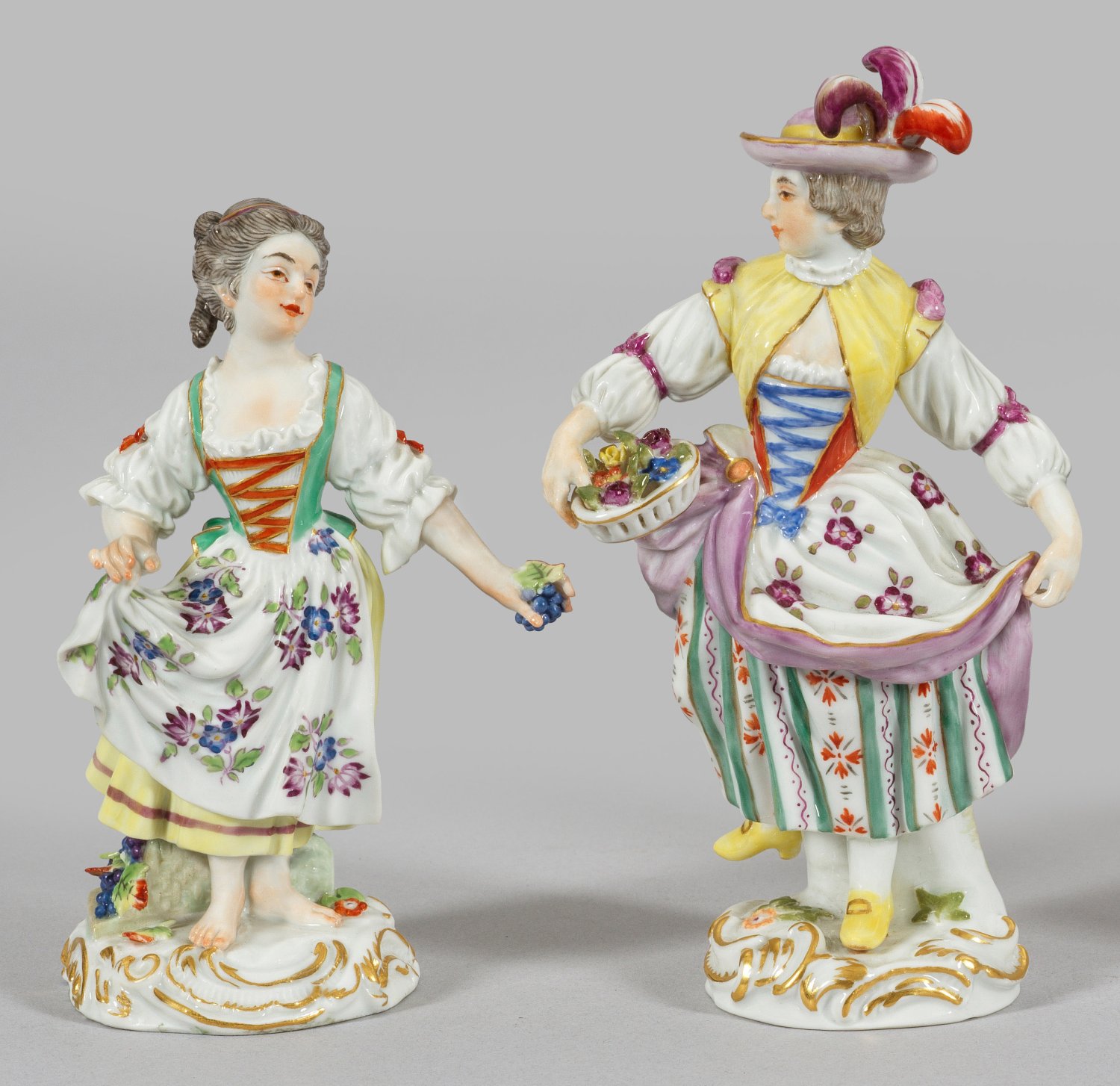 Auf rocaillereliefierten Sockeln stehende Mädchen, eine Weinrebe bzw. einen Früchtekorb haltend. Polychrome Malerei mit Goldstaffage. Entw. Johann Joachim Kaendler. Modell-Nr. 1x und 60339; Schwertermarke. H. 11,5 cm - 14 cm.