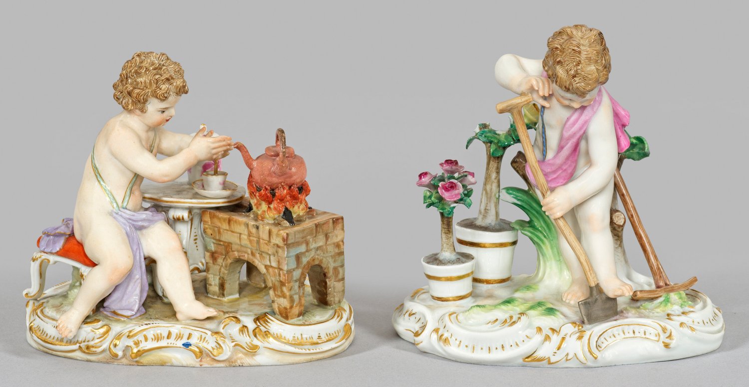Auf rocaillereliefiertem Sockel ein sitzender Knabe vor einem Herd mit Kanne über loderndem Feuer bei der Zubereitung von Trinkschokolade bzw. ein stehender Knabe, der umgeben von blühenden Topfpflanzen mit einem Spaten den Boden umgräbt. Polychrome Malerei mit Goldstaffage. Entw. Johann Joachim Kaendler. Modell-Nr. C 97, C 100. Teilw. besch.; unw. rest.; Schwertermarke. H. 11,5 cm - 12,5 cm.