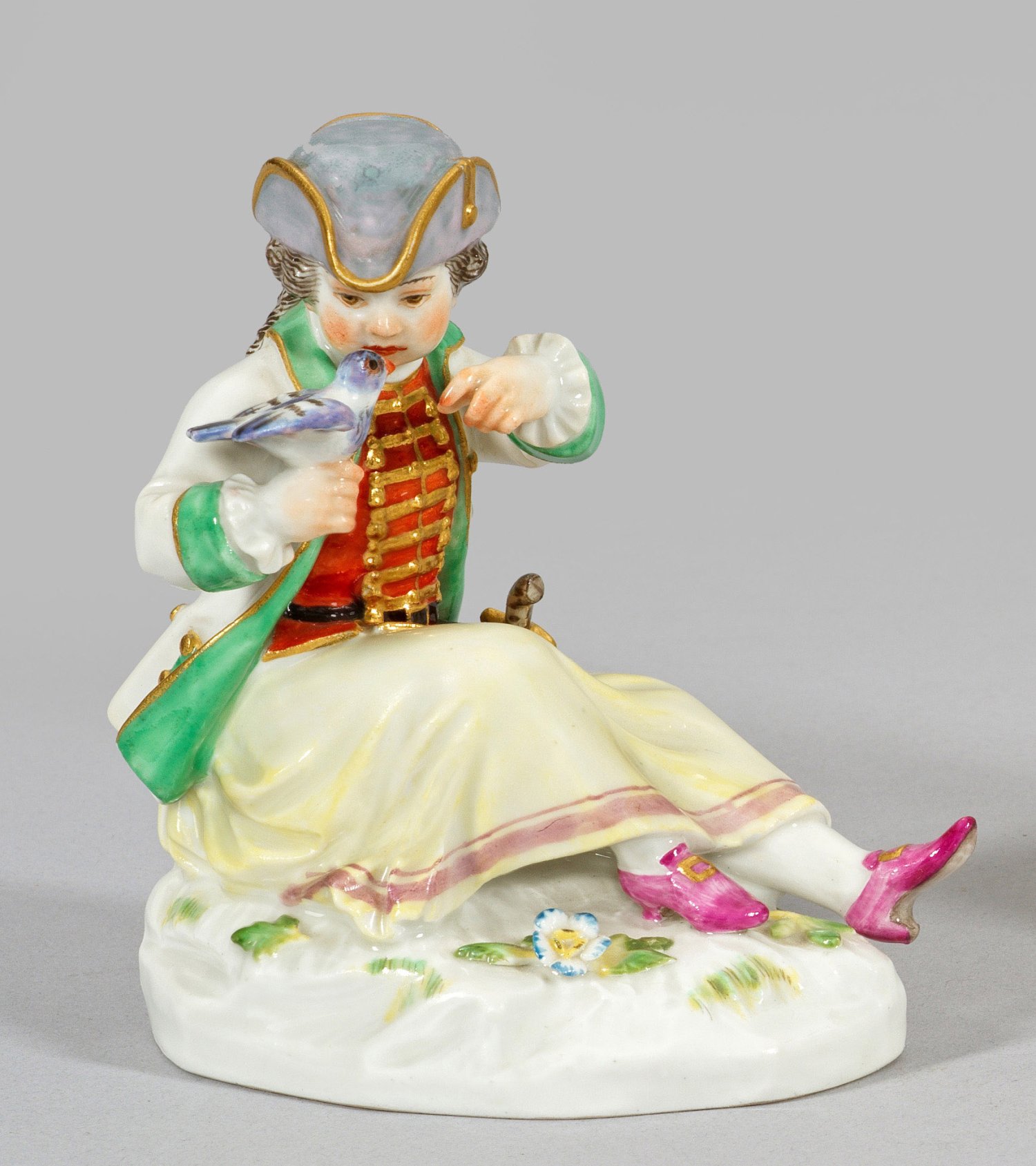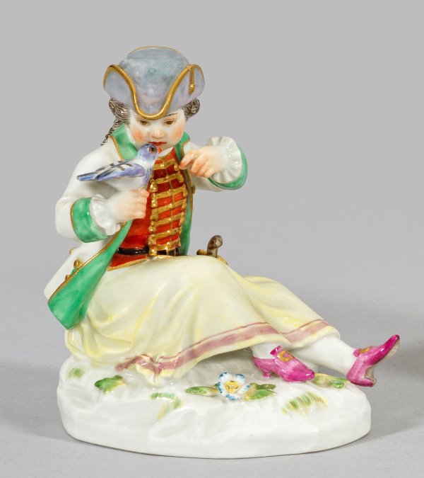 Auf ovalem, mit plastischen Blumen und Blättern belegtem Sockel sitzendes Jägermädchen, auf ihrer rechten Hand einen Vogel tragend. Polychrome Malerei mit dezenter Goldstaffage. Modell-Nr. B 30. Minim. best.; Jahreszeichen. Schwertermarke. H. 10,5 cm.