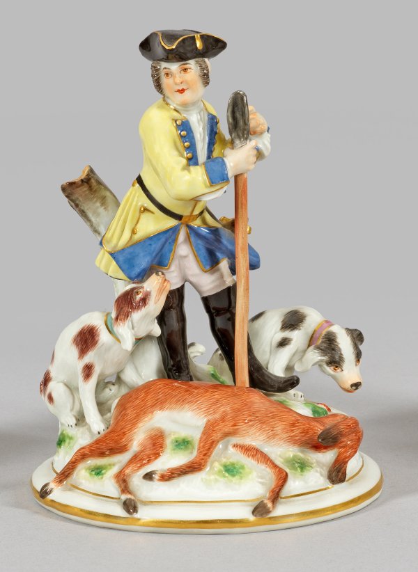 Auf gewölbtem Sockel stehender Jäger in gelbem, blau abgesetztem Jagdrock mit Dreispitz, umgeben von zwei Hunden, in der rechten Hand einen Speer haltend. Zu den Füßen liegendes, erlegtes Reh. Polychrome Malerei mit Goldstaffage. Entw. Johann Gottlieb Ehder. Modell-Nr. 223. Minim. rest.; Schwertermarke. H. 15 cm.