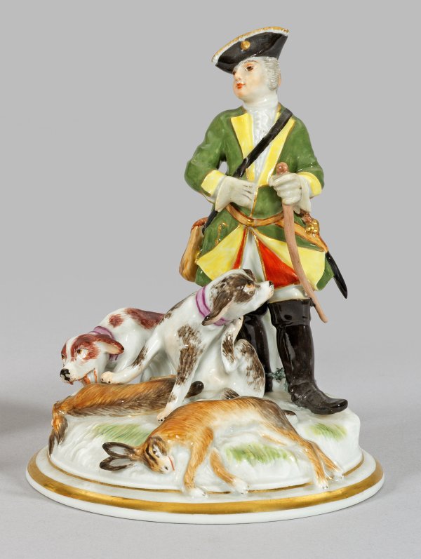 Auf gewölbtem Sockel stehender Jäger in grünem Jagdrock mit Dreispitz, umgeben von zwei Hunden. Zu den Füßen liegende, erlegte Hasen. Entw. Johann Friedrich Eberlein. Polychrome Malerei mit Goldstaffage. Modell-Nr. 63005. Minim. best.; Schwertermarke. H. 15 cm.