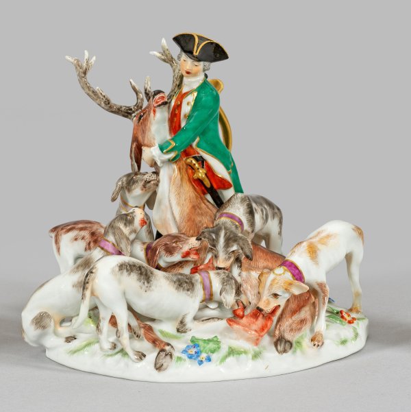 Auf naturalistisch gestaltetem Sockel stehender Jäger mit goldenem Horn, den Kopf eines erlegten Hirschen haltend. Eine Schar von Jagdhunden das liegende Tier umringend. Polychrome Malerei mit Goldstaffage. Entw. Johann Joachim Kaendler. Modell-Nr. 63048. Unw. rest.; Schwertermarke. H. 13 cm. 16 cm x 12 cm.