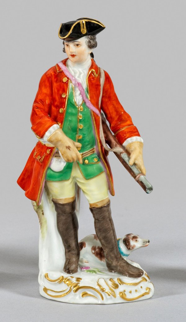 Auf rocaillereliefiertem Sockel stehender Jäger in rotem Jagdrock über moosgrüner Weste mit geschulterter Flinte. Zu seinen Füßen liegender Hund. Polychrome Malerei mit Goldstaffage. Entw. Johann Joachim Kaendler. Modell-Nr. 63015. Schwertermarke. H. 15 cm.