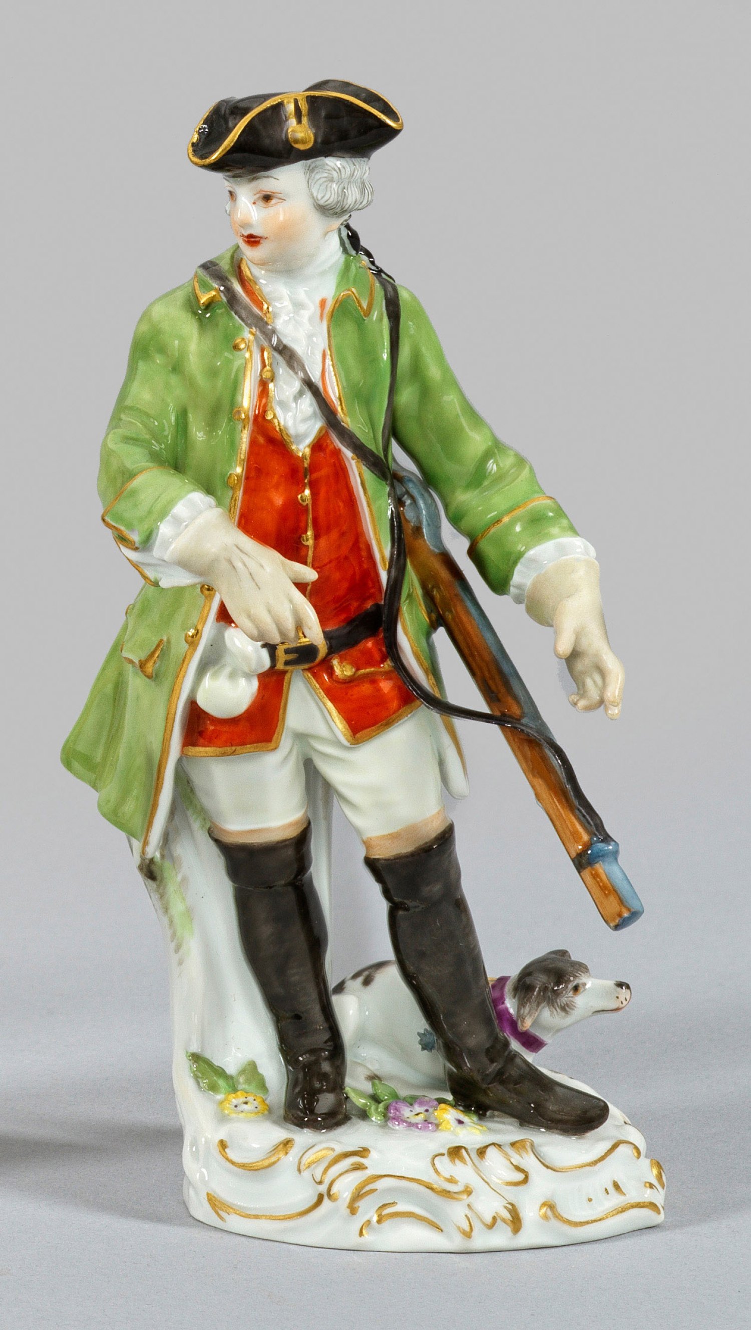 Auf rocaillereliefiertem Sockel stehender Jäger in moosgrünem Jagdrock über roter Weste mit geschulterter Flinte. Zu seinen Füßen liegender Hund. Polychrome Malerei mit Goldstaffage. Entw. Johann Joachim Kaendler. Modell-Nr. 63015. Schwertermarke. H. 15 cm.