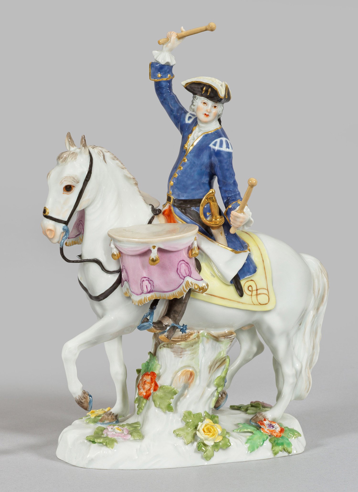 Auf ovalem, mit plastischen Blüten und Blättern belegtem Sockel, zu Pferd sitzender junger Herr, in den Händen Schlägel für die seitlich hängenden Pauken haltend. Polychrome Malerei mit Goldstaffage. Entw. Johann Joachim Kaendler. Modell-Nr. 1963. Jahreszeichen. Unw. rest.; Schwertermarke. H. 20,5 cm.