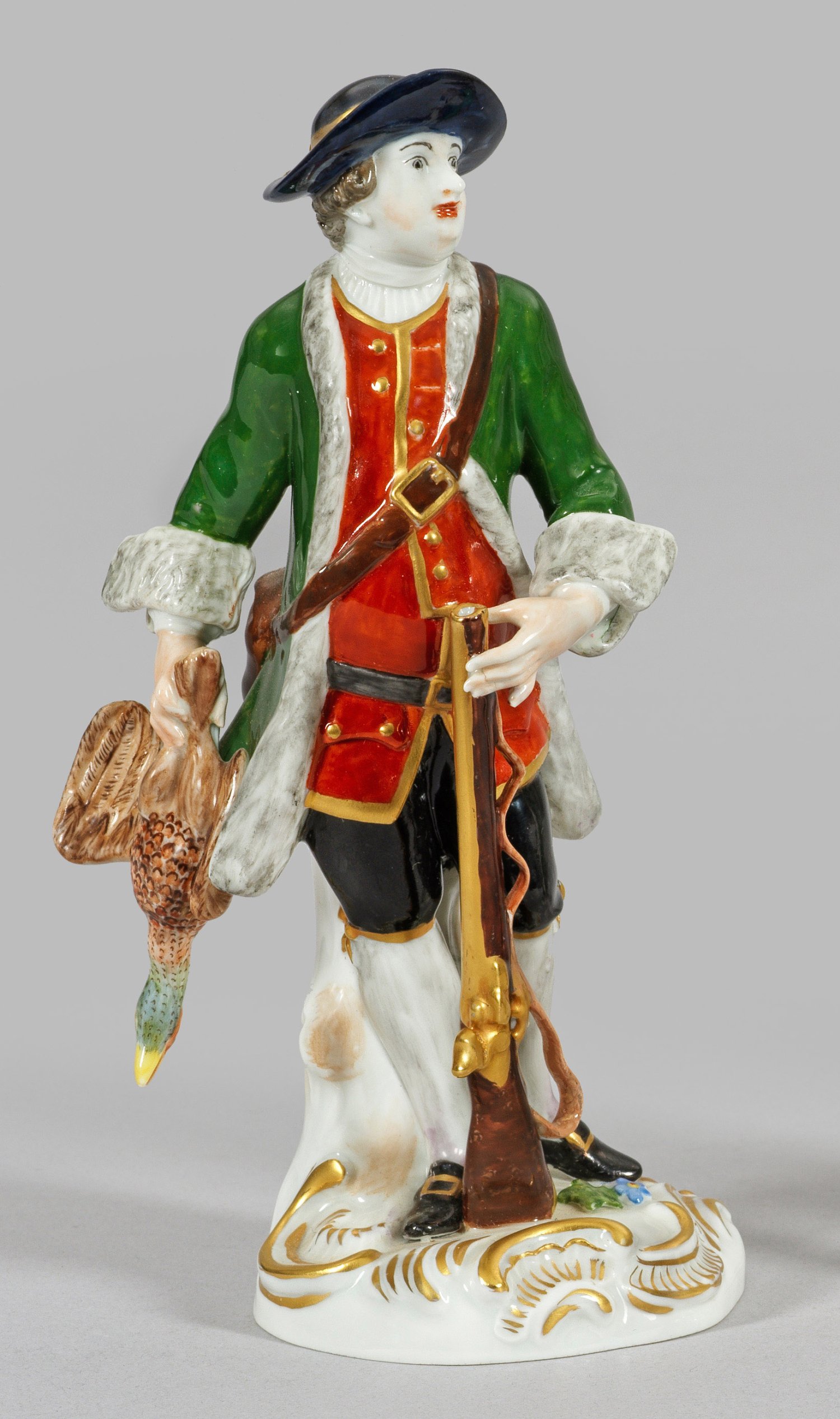 Auf rocaillereliefiertem Sockel stehender Jäger in tannengrünem Jagdrock, in der rechten Hand eine erlegte Gans haltend. Mit der Linken die auf dem Boden abgestützte Flinte haltend. Polychrome Malerei mit Goldstaffage. Modell-Nr. 63047. Unw. rest.; Schwertermarke. H. 16 cm.