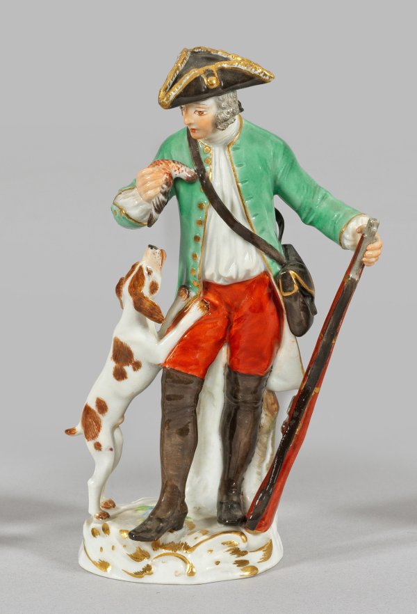 Auf rocaillereliefiertem Sockel stehender Jäger als Pariser Ausrufer, in der rechten Hand ein Gewehr, in der Linken das erlegte Tier haltend. Seitlich sich emporstreckender Jagdhund. Polychrome Malerei mit Goldstaffage. Entw. Johann Joachim Kaendler und P. Reinicke. Unw. rest.; Schwertermarke. H. 14 cm.