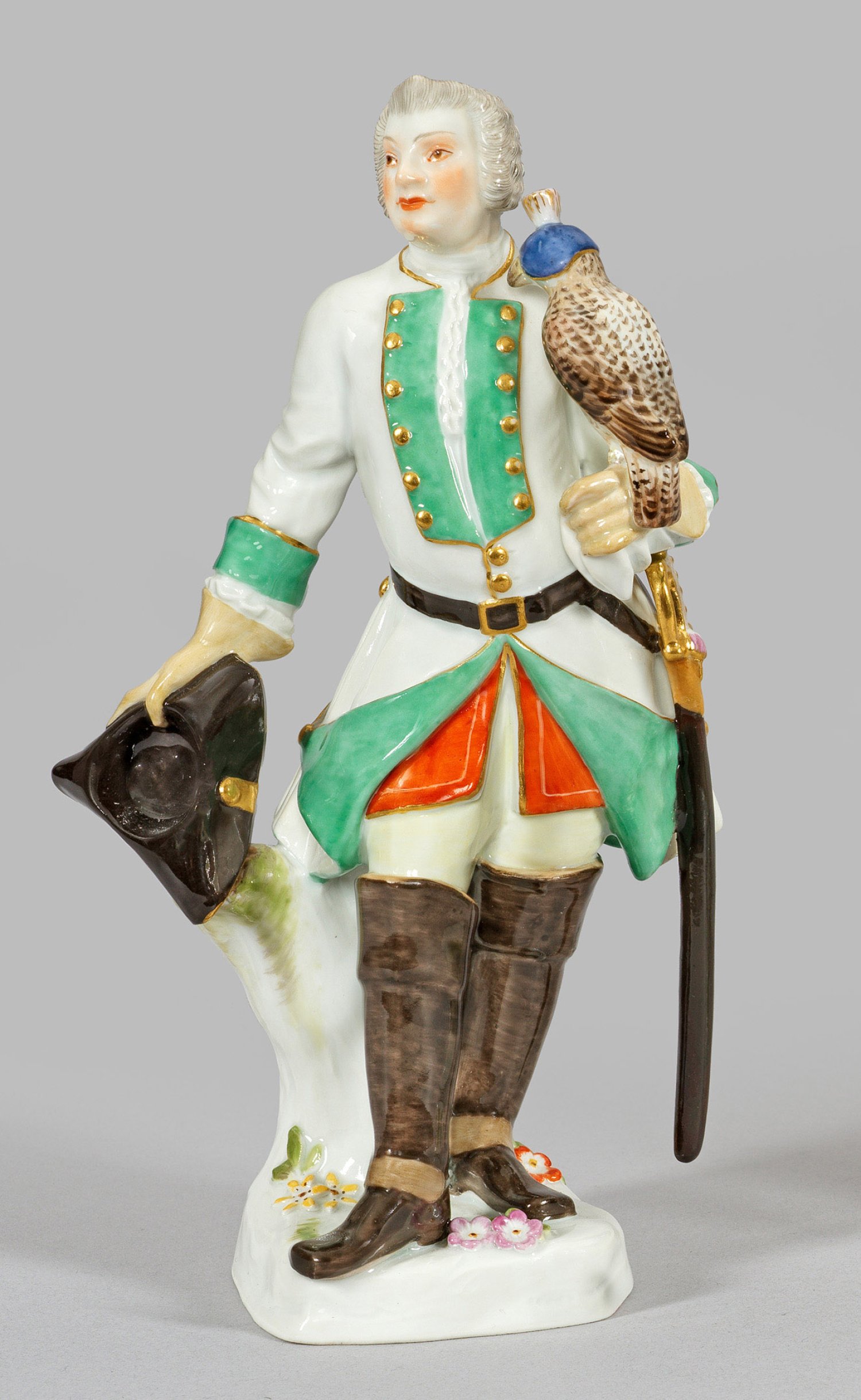 Auf rechteckigem Sockel stehender Falkner in weißem, hellgrün abgesetztem Rock, in der rechten Hand einen Dreizack haltend. Auf der Linken ein Falke sitzend. Polychrome Malerei mit Goldstaffage. Entw. Johann Friedrich Eberlein. Modell-Nr. 512 x. Unw. rest.; Schwertermarke. H. 18 cm.