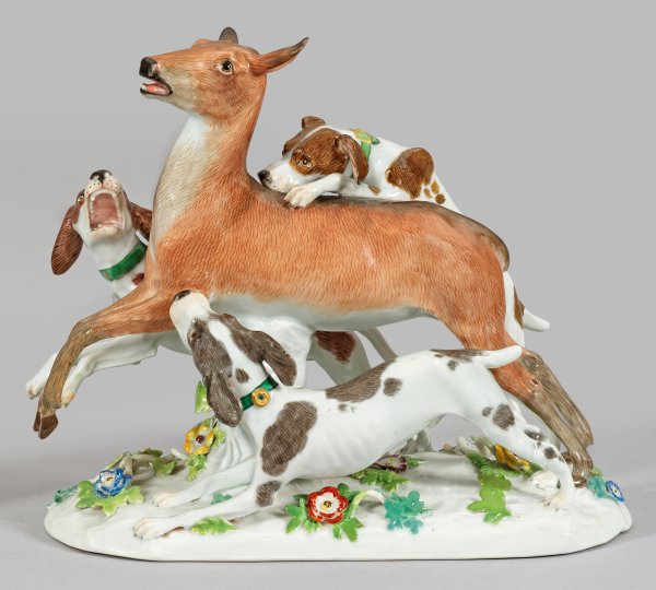 A porcelain group of a deer chased by dogs modelled by J. J. Kaendler. Insignificantly restored. Crossed swords mark.