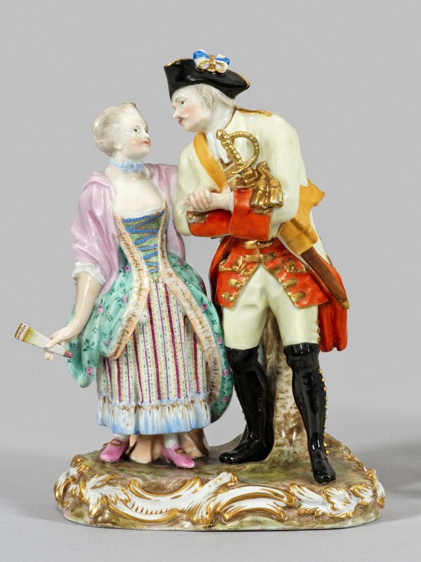 Auf einem ovalen, mit Rocaillen reliefiertem Sockel stehendes, sich an der Hand haltendes und innig anblickendes Liebespaar. Ein uniformierter Soldat mit Spitzhut und Degen und eine Dame im Mieder mit Fächer. Polychrome Malerei mit Goldstaffage. Entw. Johann Carl Schönheit. Modell-Nr. E 13. Minim. rest.; Schwertermarke. H. 19 cm.