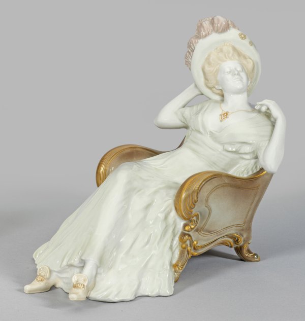 Elegante junge Salondame im Abendkleid in einem Louis-Philippe Sessel. Mit der einen Hand ihren Straußenfedernhut stützend, mit der anderen Hand einen Fächer aus Federn leger über die Schulter legend. Hutschmuck und Kette aus Reliefgold mit Emailtropfen. Überwiegend polychrome, pastelltonige Malerei mit Goldstaffage. Entw. Hermann Hubatsch, 1908. Entw.-Bez. mit Dat. "H. Hubatsch (19)08". Undeutl. Ritzsign.; Modell-Nr. 9067. Jahreszeichen. Minim. rest.; Zepter- und Malereimarke. H. 24 cm. B. 30 cm.