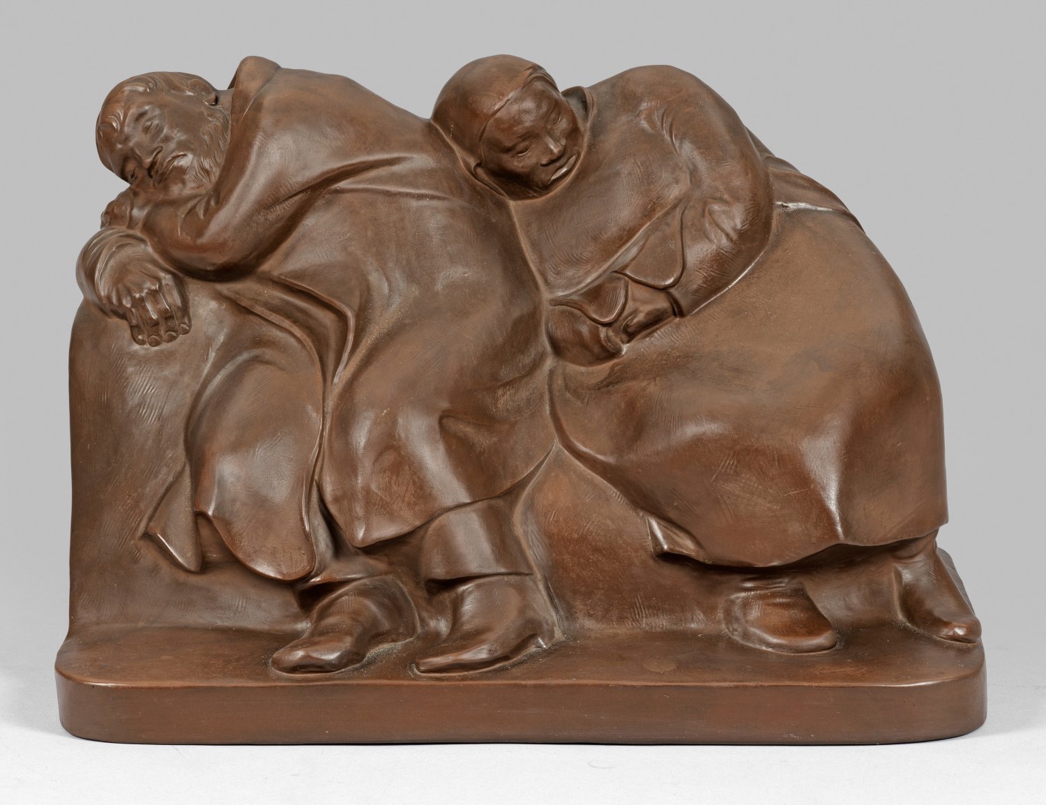 (auch "Schlafende Vagabunden"). Über rechteckigem Sockel, auf einer Bank eng nebeneinander sitzendes Vagabundenpaar, im Schlaf nach rechts geneigt. Entw. Ernst Barlach, 1912. Entw.-Bez.; Modell-Nr. A 1072. Jahreszeichen. Eingepresste Schwertermarke. H. 28,5 cm. 42,5 cm x 30 cm.
