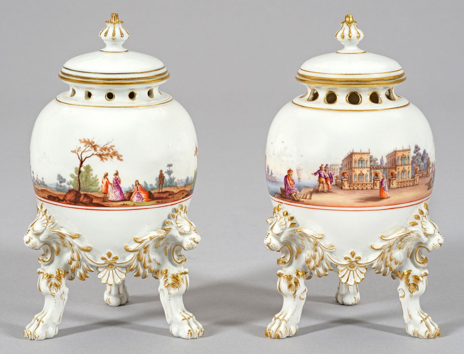 Von hohen Tatzenfüßen mit reliefplastisch gearbeiteten, geflügelten Löwenköpfen getragener, ovoider Korpus mit gekehltem, durchbrochen gearbeitetem Hals und leicht gewölbtem Deckel mit Knospenknauf. Umlaufend der Wandung galante Paare in weitläufiger Landschaft bzw. Hafenszene mit Segelbooten in viel befahrener See mit südländischer Palastarchitektur. Feine polychrome Malerei mit Goldstaffage. Modell-Nr. K 112. Deckel rest.; Schwertermarke. H. 17,5 cm.