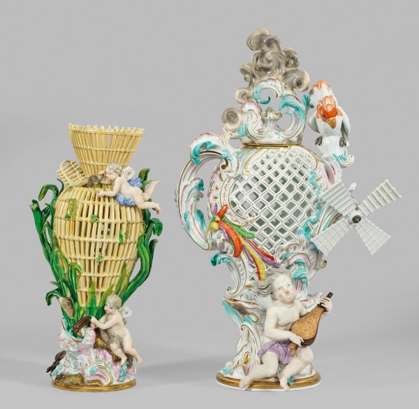 In großer und kleiner Variante Luft und Wasser symboliserend. Podestförmig eingezogener Sockel mit bewegt reliefierten Muscheln und Schilf. Zentral sitzender Knabe als Amor, das seitlich der Wandung angebrachte Windrad mit einem Blasebalg antreibend, die Luft symbolierend. Oberhalb aufsteigender, balusterförmiger, teilw. gitterartig durchbrochen gearbeiteter Korpus, gerahmt von Rocaillen. Seitlich des Sockels aufsteigendes, teilw. freiplastisch gestaltetes Rocaillewerk in Federschmuck übergehend und auf den plastischen Papageien weisend. Passige, teilw. wolkig durchbrochen gearbeitete Deckelbekrönung. Das Gegenstück: Über profiliertem Rundfuß naturalistisches, in Form von Wellen und Felsen mit Krebstier gestaltetes Terrain, umzogen von stark reliefplastischen Rocaillen. Darüber zwischen Wasserpflanzen aufsteigender Vasenkorpus in Gestalt eines durchbrochen gearbeiteten Korbes, aus dessen Öffnung ein plastisch gestalteter Aal herauskriecht. Unterhalb sitzender Putto mit Fangnetz, in der rechten Hand einen Fisch haltend. Polychrome Malerei mit reicher Goldstaffage. Entw. Johann Joachim Kaendler, 1747. Rest.; Schwertermarke. H. 80 cm und 58,5 cm.