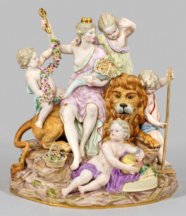 Auf unregelmäßig gehöhtem Steinsockel auf einem Löwen sitzende Göttin Cybele mit goldener Mauerkrone, in der rechten erhobenen Hand den Schlüssel der Unterwelt tragend, mit dem linken Arm ein Füllhorn mit kostbarem Schmuck. Umgeben von Amoretten, einen Blütenreigen darbietend, liegend mit Sichel, arbeitend mit Hacke bzw. sie umringend. Polychrome Malerei mit Goldstaffage. Entw. Michel Victor Acier. Modell-Nr. D. 83. Unw. rest.; Schwertermarke. H. 24 cm.
