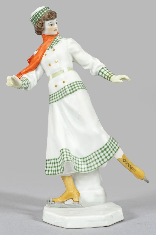 Auf einer eisschollenförmigen Plinthe eine junge, in schwungvoller Drehbewegung dargestellte Dame beim Eislaufen. Polychrome Malerei. Entw. Alfred König, um 1910 - 1911. Modell-Nr. Z 194. Unw. rest.; Schwertermarke. H. 21 cm.