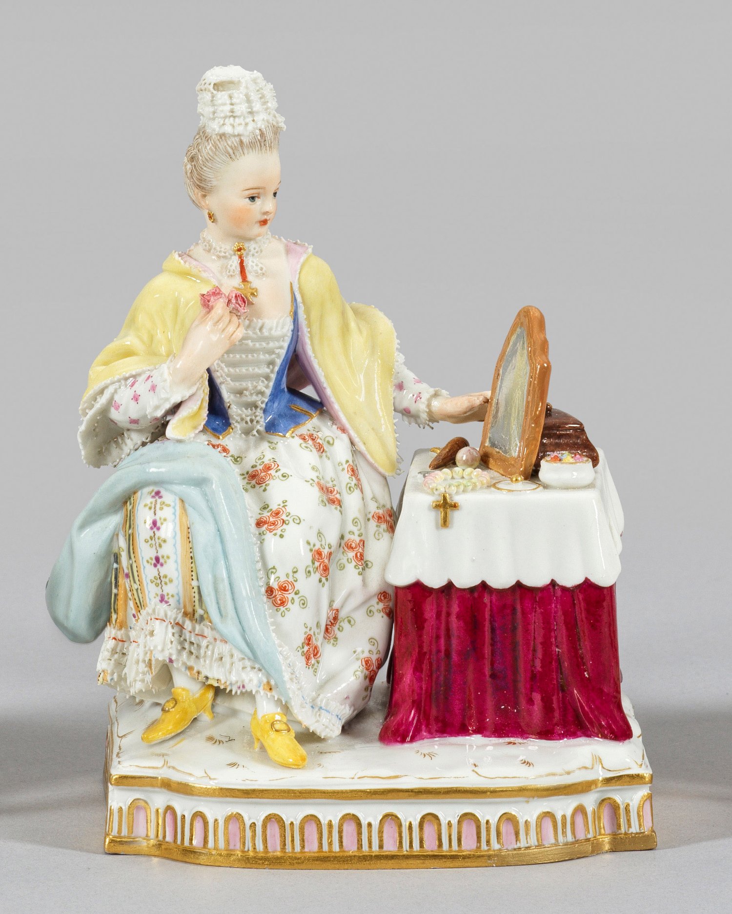 aus der Serie "Fünf Sinne". An einem Tisch sitzende junge Dame, in einen Spiegel blickend. Polychrome Malerei mit Goldkonturierung. Entw. Johann Carl Schönheit. Modell-Nr. E3. Best.; rest.; Schwertermarke. H. 14 cm.