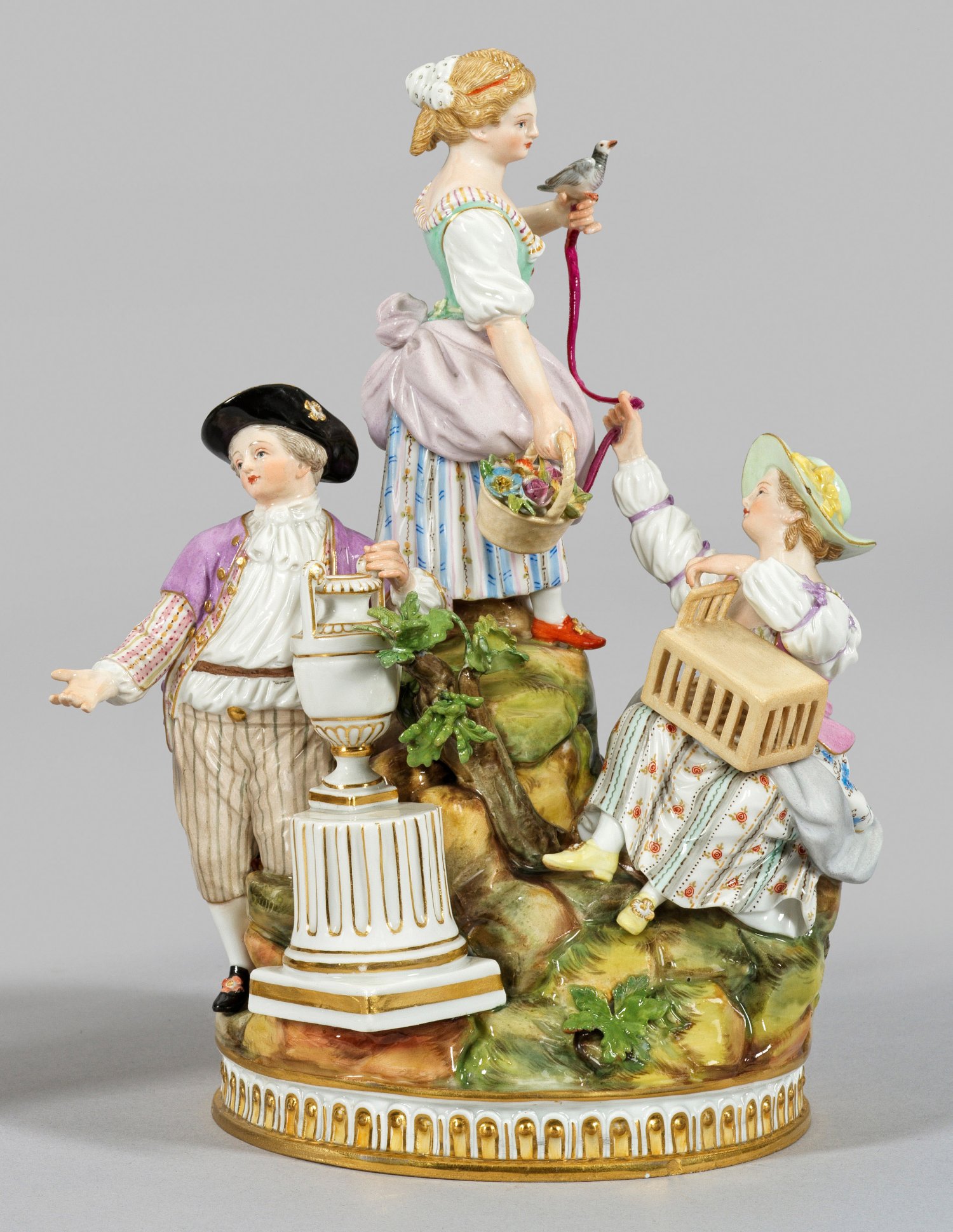 Runder Sockel mit umlaufendem Ornamentfries. Auf gehöhtem, felsartigen Podest an Baumstamm lehnende junge Dame mit Blumenkorb. In ihrer Linken einen Vogel an einem Band festhaltend. Unterhalb sitzende Dame mit leerem Vogelkäfig, das Ende des Bandes greifend. Gegenüber, junger Herr neben erhöht stehender Amphorenvase. Farbige Bemalung mit Gold. Unw. rest.; Entw. Michel Victor Acier. Modell-Nr. F 94. Schwertermarke. H. 22 cm.