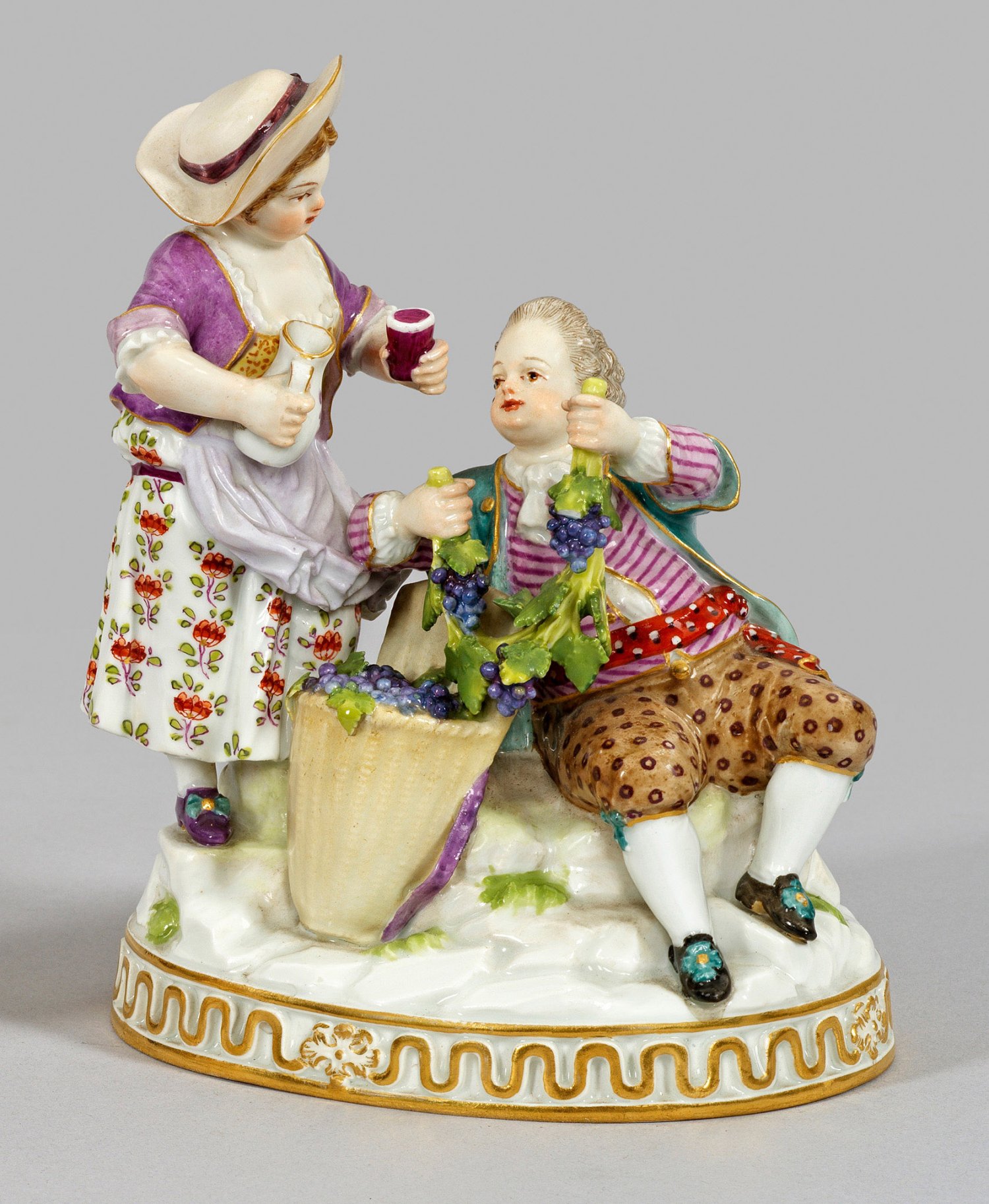 Aus der Serie 'Die Jahreszeiten". Auf flachem Felssockel sitzender Knabe, mit beiden Händen eine Girlande aus Weinlaub und Trauben haltend. Nebenstehendes Mädchen mit rundem Hut und wehender Schürze, in den Händen eine Weinkaraffe und ein Becher. Zwischen den beiden eine mit dunklen Trauben gefüllte Kiepe. Polychrome Malerei. Goldkonturierung. Minim. best.; Modell-Nr. F 92. Entw. Michel Victor Acier. Schwertermarke. H. 15 cm.