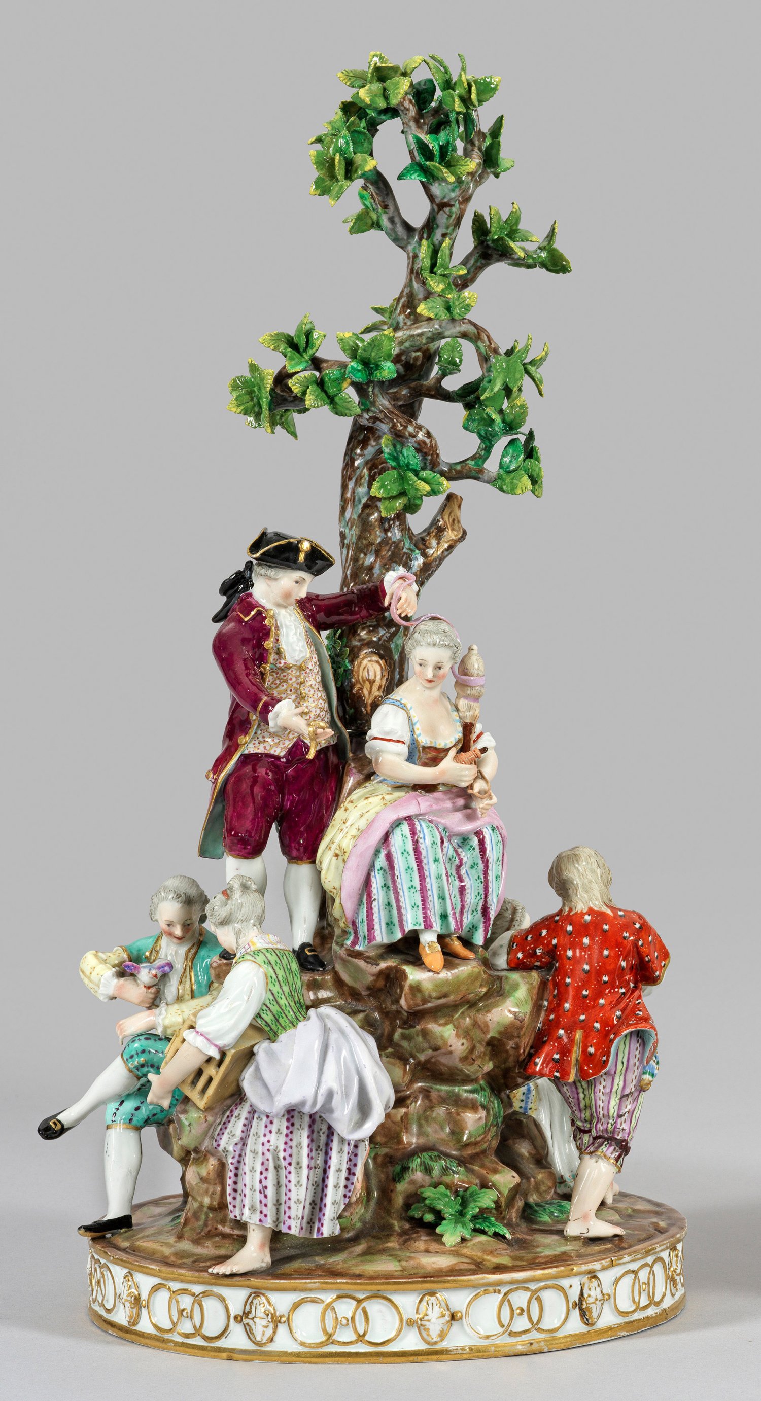 2-tlg.; Teilw. montiert. Ornamental reliefierter, baumbestandener Rundsockel. Auf felsiger Anhöhe in unterschiedlichen Ebenen stehender Kavalier mit Taschenuhr und Dame mit Spindel. Unterhalb sitzendes Liebespaar. Rückseitig ein sitzender Herr mit Taube und eine junge stehende Dame mit offenem Käfig für den Vogel. Polychrome Malerei mit Goldstaffage. Entw. Michel Victor Acier, 1772. Unw. best./rest.; Schwertermarke. H. 45 cm.