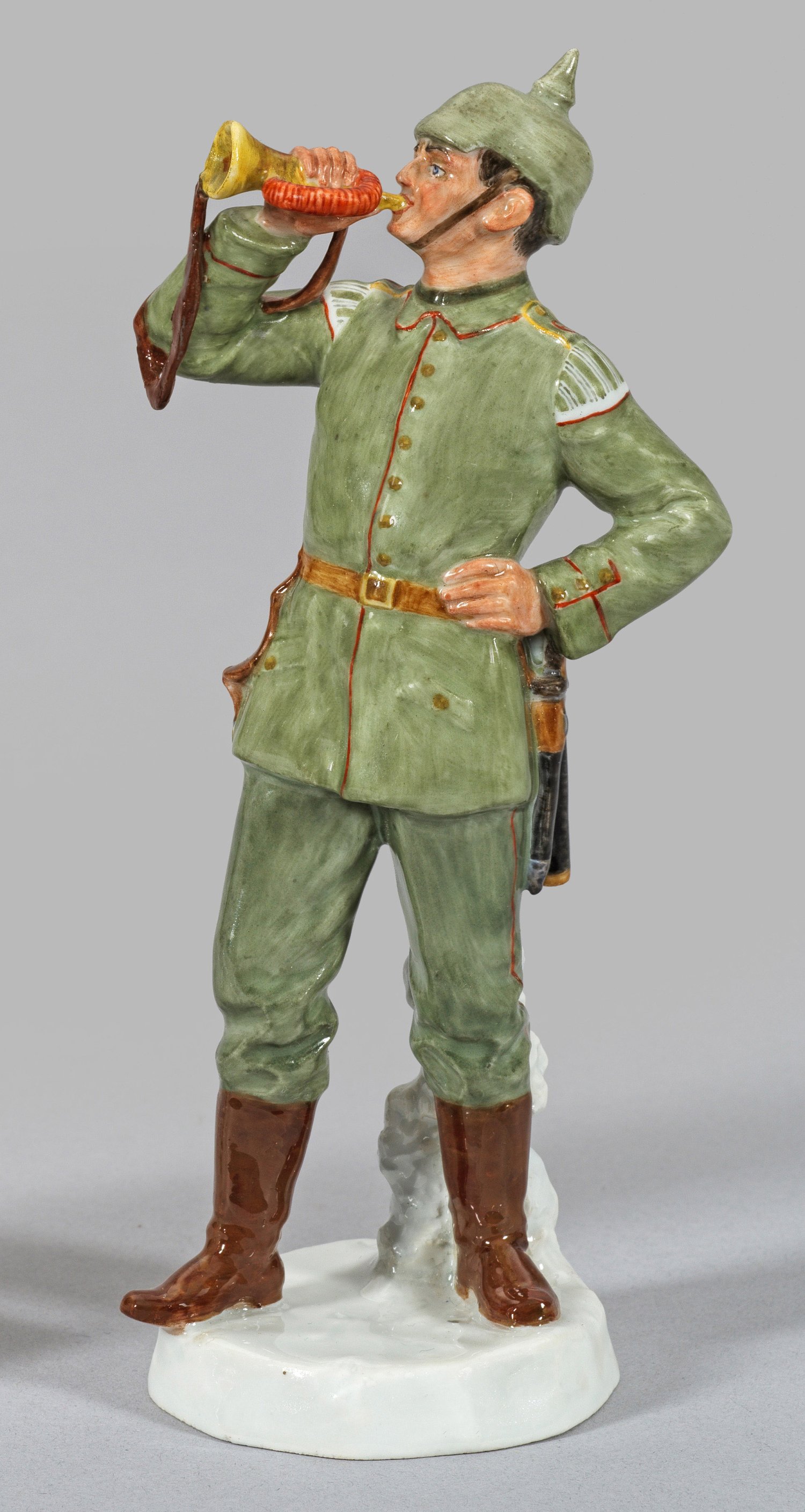 Auf einem ovalen Sockel, neben einem Felsbrocken stehender Infanterie-Soldat mit Pickelhaube und grüner Uniform, in ein Horn blasend. An seinem Gürtel befestige Utensillien und Waffen. Naturalistische polychrome Malerei. Entw. wohl Alfred König, um 1915. Entw.-Monogr. Modell-Nr. F 208. Minim. rest.; Schwertermarke. H. 15,5 cm.