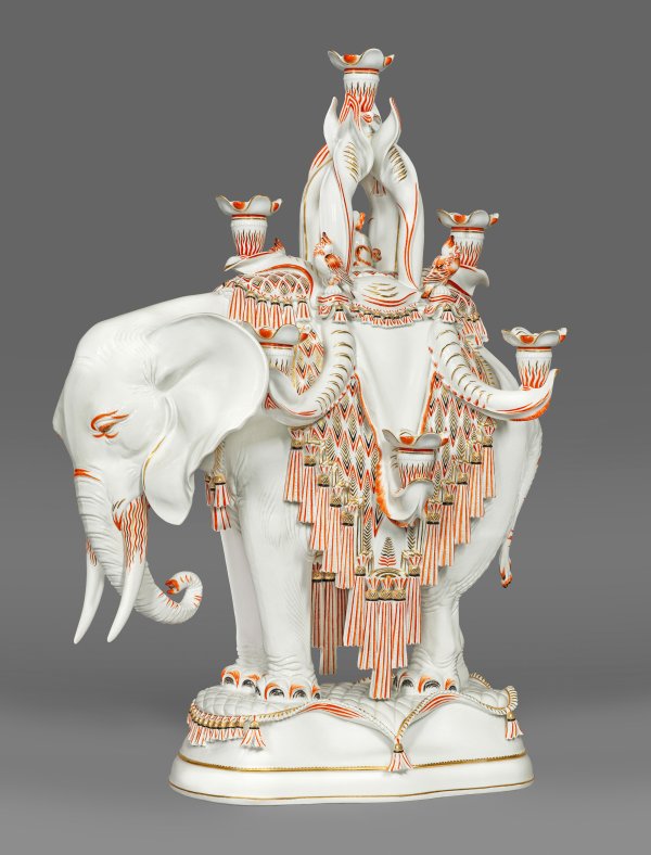 Auf einem unregelmäßig rechteckig abgerundeten und leicht aufgewölbten, von einer Decke mit Troddeln umspannten Sockel stehender Elefant mit eingezogenem Rüssel. Auf dem Rücken ruht eine Satteldecke mit strahlenförmig hängenden Quasten und Troddeln, die dem rautenfömigen Muster der Decke entsprechen. Baldachinartige Bekrönung in dessen Zentrum ein Hund, flankiert von vier, auf kissenfömigen Podesten sitzenden Vögeln thront. Insgesamt neun knospenfömig stilisierte Kerzentüllen in verschiedenen Positionen und an unterschiedlich gebogenen Armen säumen den Sattel. Überwiegend korallenrote sowie kapuzinerbraune und schwarze Malerei mit Goldstaffage. Entw. Max Esser, 1924. Modell-Nr. 79351. Jahreszeichen. Schwertermarke. H. 72 cm. B. 50 cm.