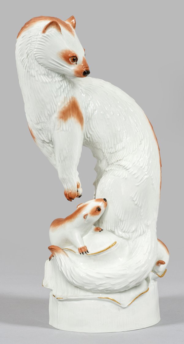 Auf gehöhtem, stilisierten Natursockel stehender, sich aufrichtender sowie umwendender Iltis. Der schlanke, langgestreckte Körper mit bogenförmig geschwungenem Rücken ist kraftvoll nach rechts eingedreht. Leicht reliefierte Fellzeichnung. Unterhalb die zwei schleichenden Iltis-Jungen. Sparsam akzentuierte, polychrome Malerei in verschiedenen Brauntönen mit Goldkonturierung. Entw. Max Esser, 1926. Modell-Nr. 78708. Schwertermarke. H. 38 cm.