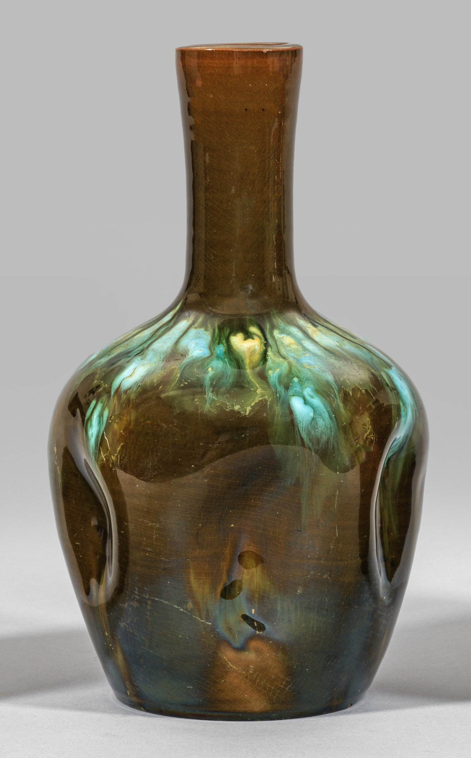 Keramik. Ovoider, am Bauch fünffach eingedrückter Korpus, zylindrischer Röhrenhals. Farbige, glänzende Überlaufglasur in braunen, olivgrünen, türkisblauen und ockergelben Tönen. Entw. Christopher Dresser, um 1880, für die Linthorpe Art Pottery. Pressmarken. H. 22,3 cm.