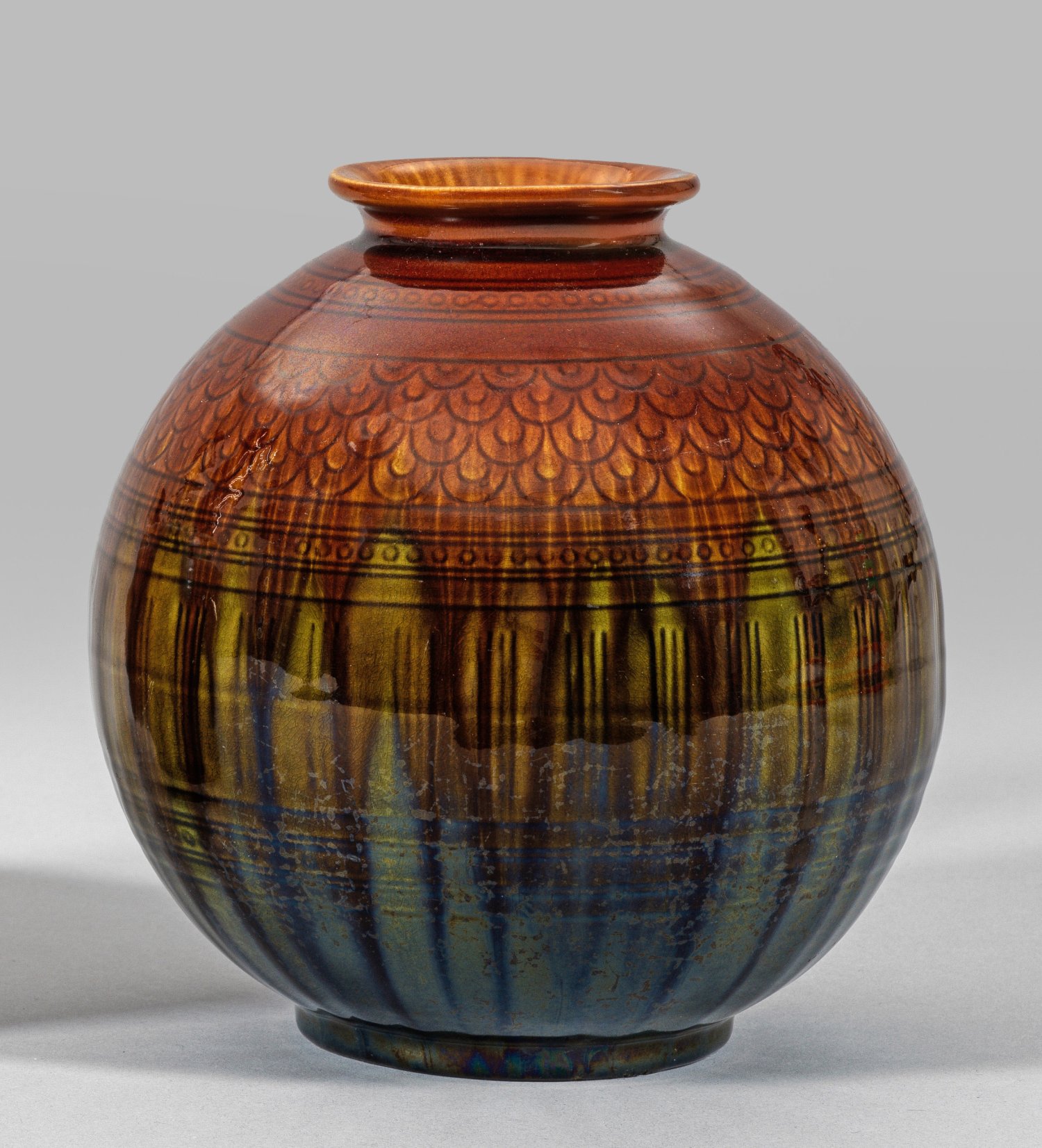 A glazed globular-shaped ceramic vase with incised decor designed by Christopher Dresser for Linthorpe Art Pottery, circa 1880. Model-no. 242. Impressed marks. Label "Joy Hallam Collection".