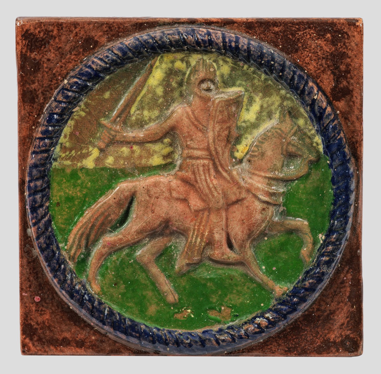 Irdenware, sog. "Cadiner Majolika". Quadratisch, rückseitig gehöhlt, an der Oberkante zwei originale Aufhängelöcher. Reliefdekor mit Deutschordensritter zu Pferde im Kreis, polychrom bemalt bzw. glasiert. Werkstatt-Pressmarke. 16 cm x 16 cm.
