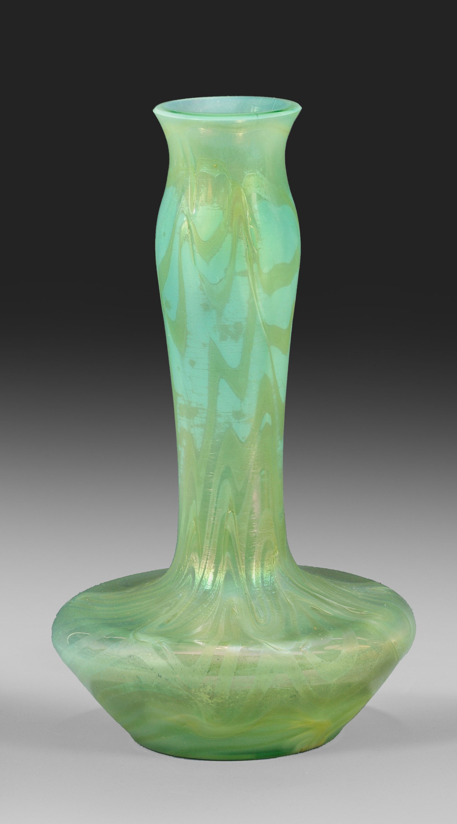 Hellgrünes, opalisierendes Glas mit aufgeschmolzenem Dekor aus silbergelben Fäden, reduziert und irisiert. H. 16,5 cm.