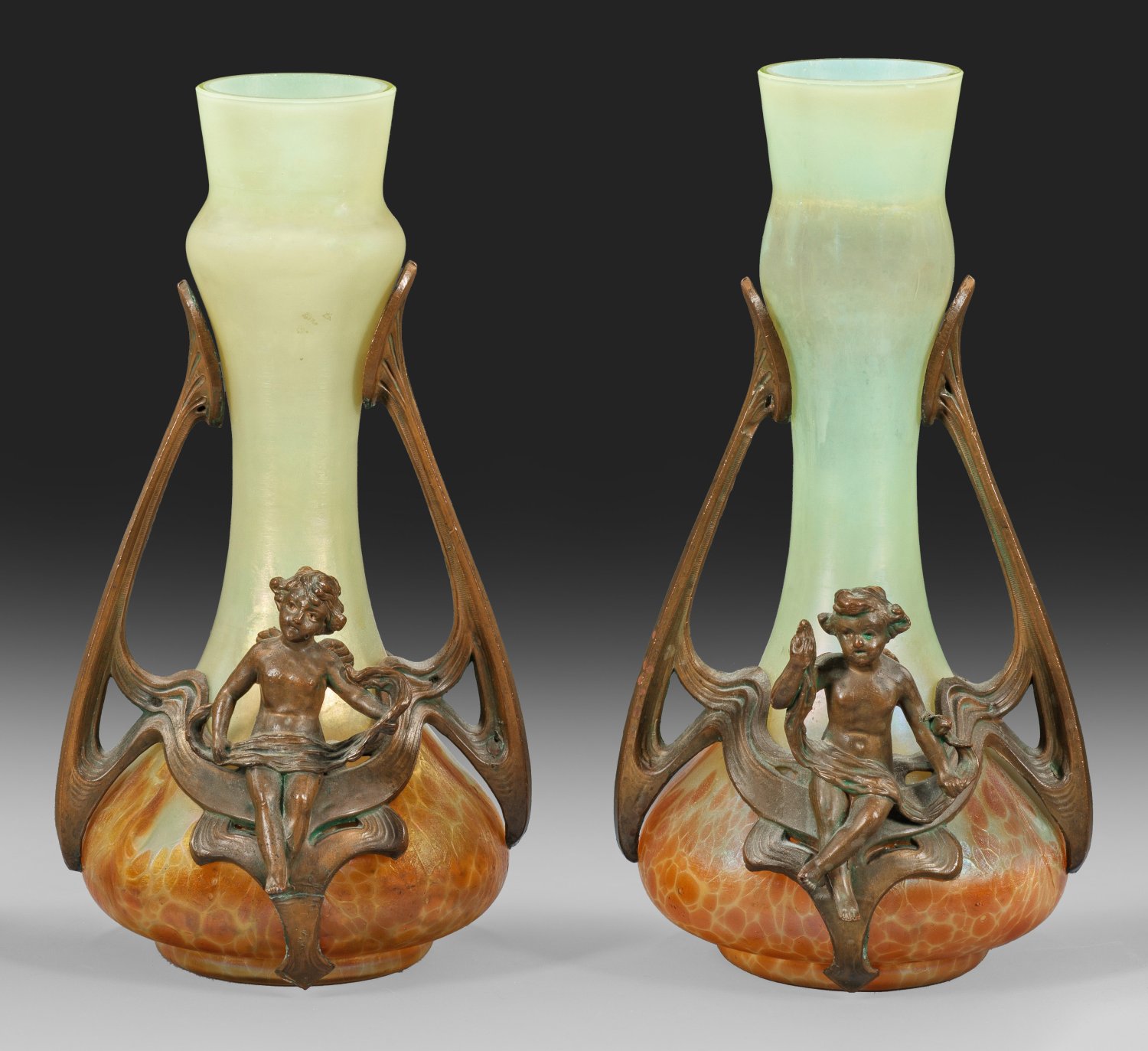 Gegenstücke. Überfangglas, farblos bzw. weißlich-opalisierend mit eingearbeiteten, orangefarbenen Kröseln, reduziert und irisiert. Die braun patinierte Montierung mit plastischen, sitzenden Putti und zwei stilisierten, blattartigen Henkeln. H. 20,5 cm.