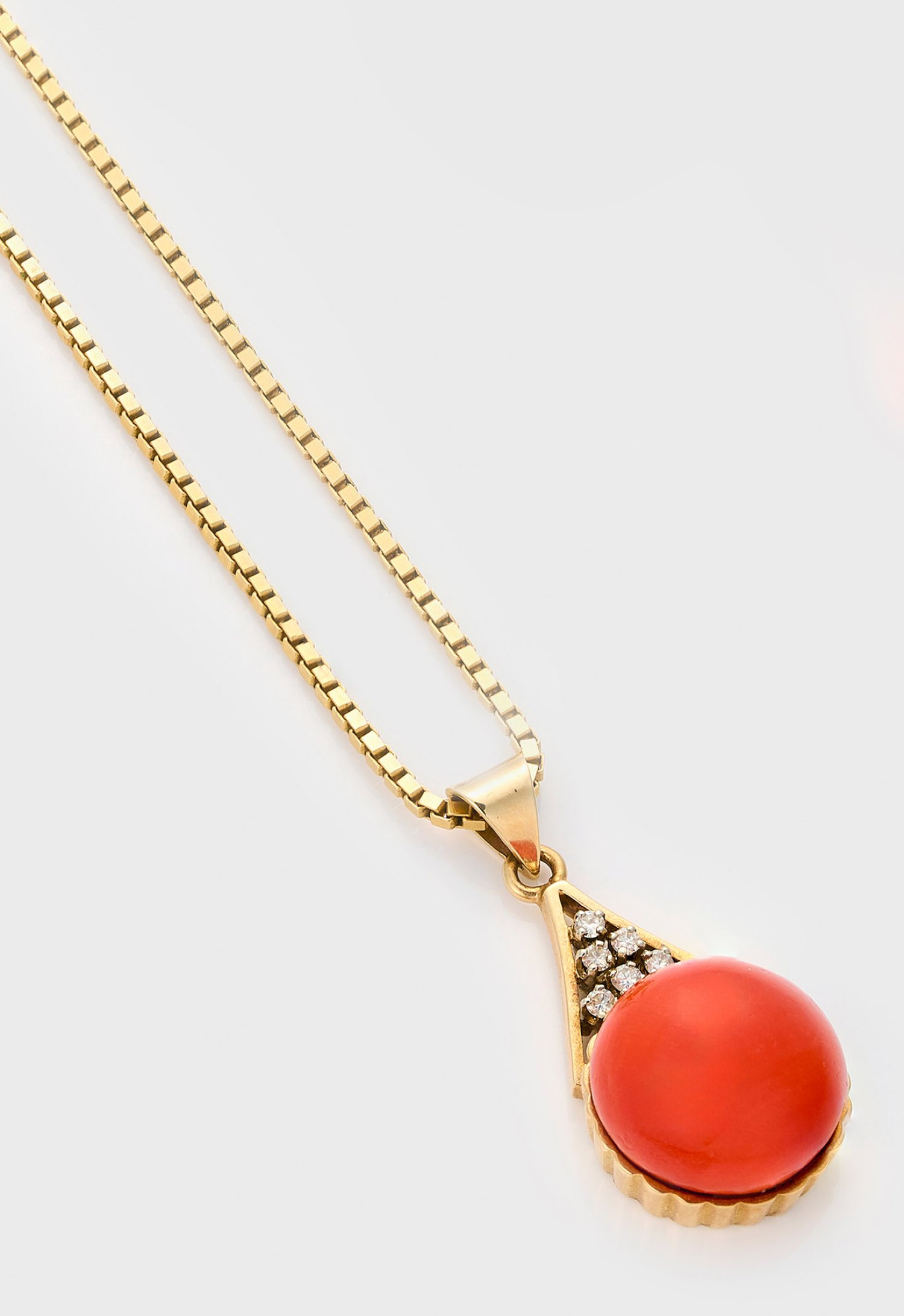 Gelbgold, gest. 585. Anhänger besetzt mit einem roten Korallencabochon, akzentuiert durch Brillanten von zus. ca. 0,10 ct., an Milanese-Kette. Ges.-Gew. ca. 22,15 g.