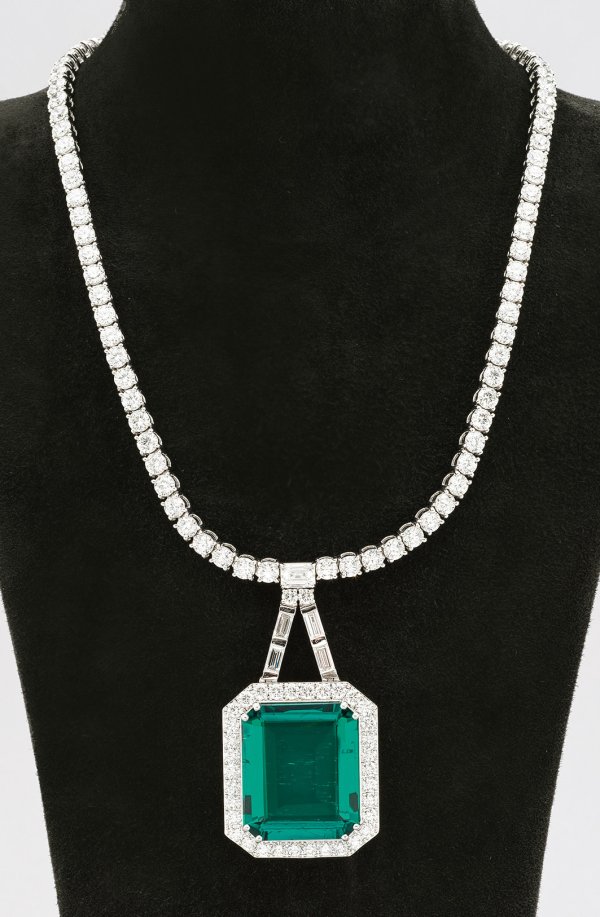Weißgold, gest. 750. Collier besetzt mit einem Laboratory Grown Smaragd von ca. 46,13 ct. und Laboratory Grown Diamanten von zus. ca. 32,44 ct. (E-F/vvs-vs). Gew. ca. 67,38 g.