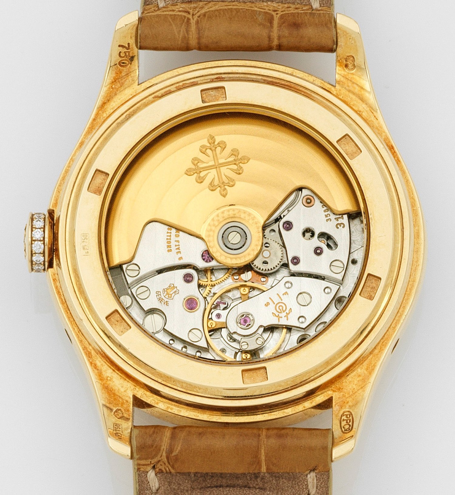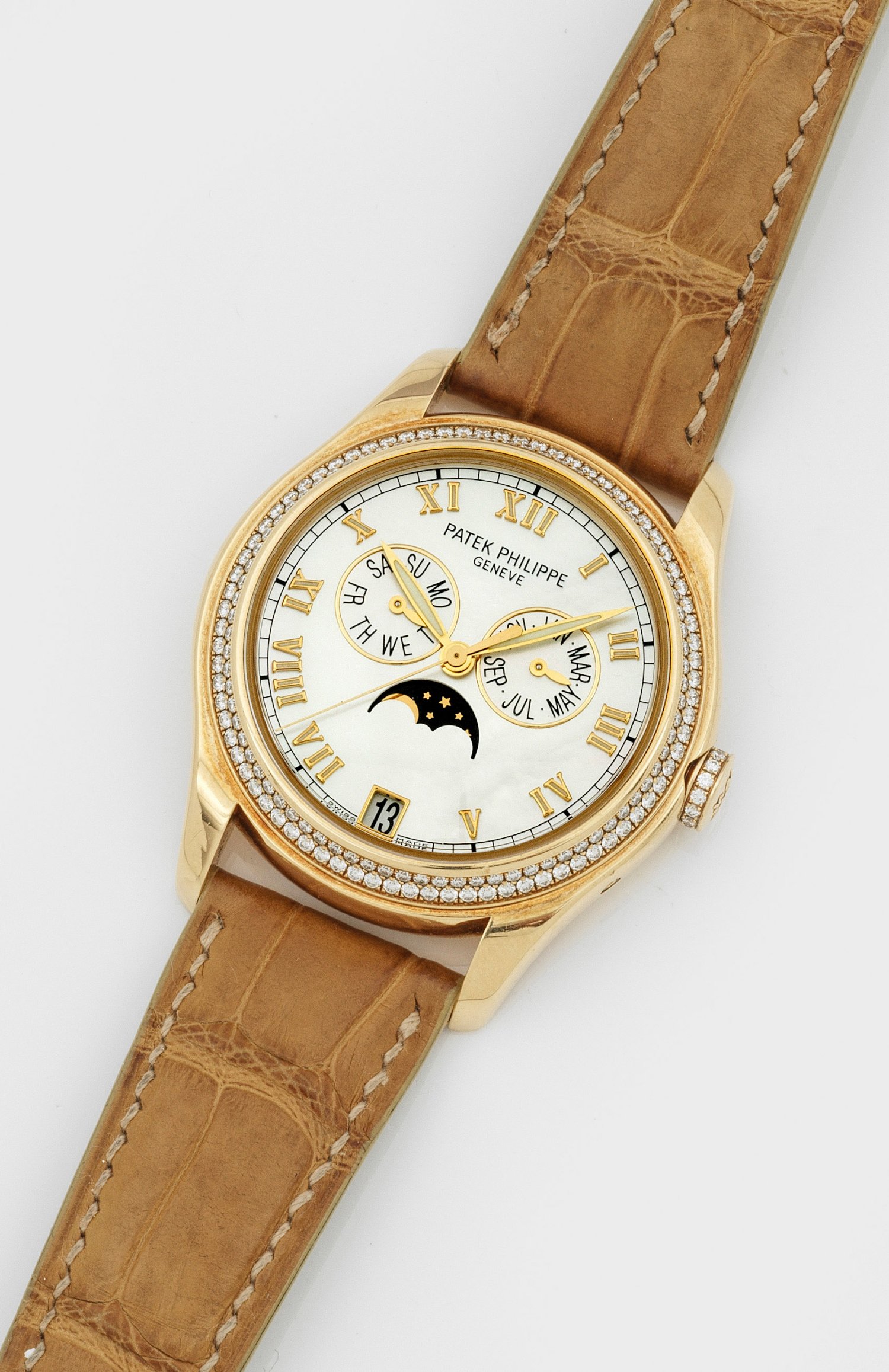 Gelbgold, gest. 750. Rundes Uhrengehäuse, Lunette umlaufend besetzt mit Diamanten von zus. ca. 1,00 ct., Bali-Perlmutt-Zifferblatt mit römischen Zahlen und Lanzenzeigern mit Tritiumauflage, Wochentag- und Monatsanzeige, Zentrale Sekunde aus der Mitte, Datumsanzeige und Mondphase, Glasboden. Automatikwerk mit Kaliber 315 S OA Lu. Beigefarben geprägtes Lederarmband mit Patek-Gold-Dornenschließe. Ref.-Nr. 4936J-001, 3582186/4379716. D. 37 mm. Herstellerzeichen. Gew. ca. 76,39 g. Original-Zertifikat.