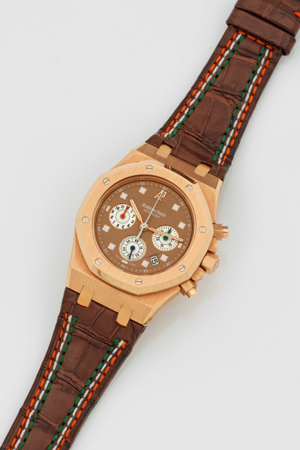 Roségold, gest. 750. Oktogonales Uhrengehäuse, karamellfarbenes geprägtes Zifferblatt, Leucht-Punktindexe und Zeiger, Datumsanzeige, Stunde, Kleine Sekunde, Zentralsekunde. Automatikwerk Kaliber 2385, Chronograph. Hellbraunes, geprägtes Lederarmband mit indischen Flagnähten, doppelte AP-Gold-Schließe. Auflage 138-150. Modell-Nr. 26161OR.OO.D088CR.01. Serien-Nr. G72745-734787-0138. Herstellerzeichen. D. 41 mm. Gew. mit Armband ca. 160,19 g. Original Holzbox und Audemars Piguet-Registerauszug.