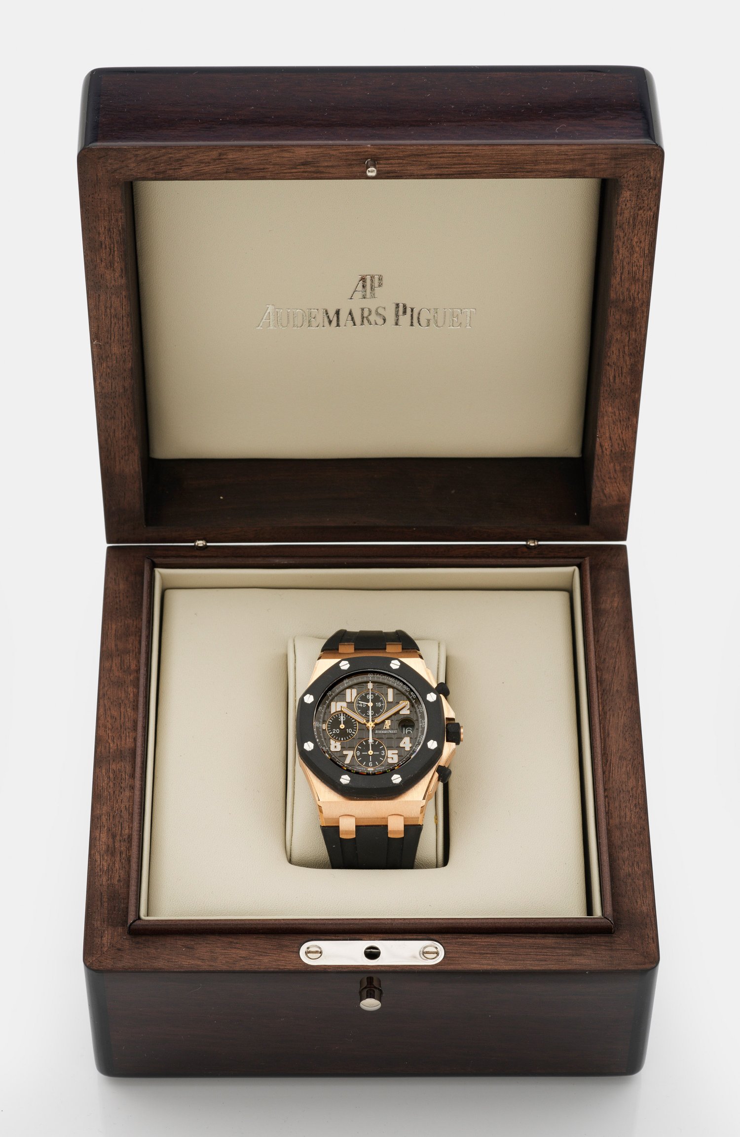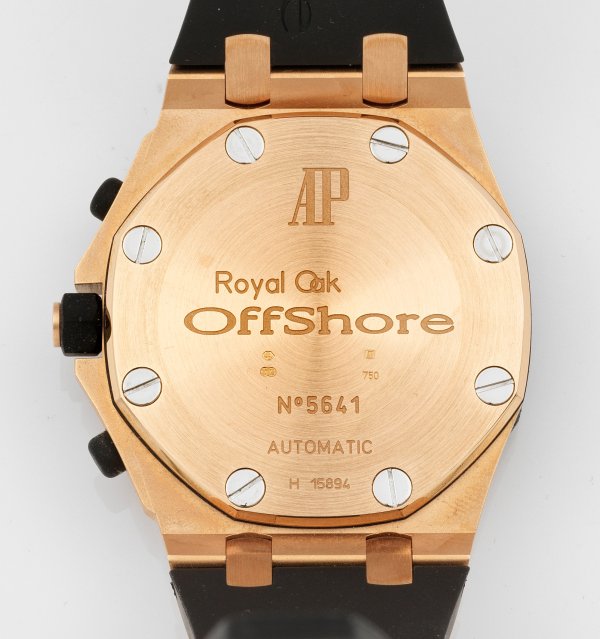 Roségold, gest. 750. Oktogonales Uhrengehäuse, anthrazitfarbenes, geprägtes Zifferblatt, Tachymeterskala, arabische Leuchtzahlen und Zeiger, Datumsanzeige, Stunde, Kleine Sekunde, Zentralsekunde. Automatikwerk Kaliber 2326/2840, Chronograph. Schwarzes Kautschuk-Armband mit doppelter AP-Gold-Schließe. Garantie-Nr. A8G8G9.0262. Ref.-Nr. 25940OK.00.D002CA.02. Gehäuse-Nr. H15894-5641. Herstellerzeichen. D. 41 mm. Gew. mit Armband ca. 225,72 g. Original Holzbox und Audemars Piguet-Garantie mit Service Buch.