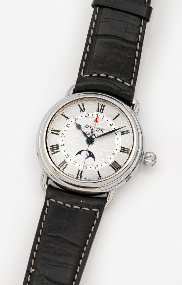 Stahl. Rundes, profiliertes Uhrengehäuse, fein guillochiertes Zifferblatt, schwarze römische Zahlen und Dauphinzeiger, Wochentag- und Monatsanzeige, Kalender, Mondphase und Zentrale Sekunde. Schwarzes, geprägtes Lederarmband mit doppelter Faltschließe. Automatikwerk. Herstellerzeichen. Ungetragen. Original Makassar-Holzbox.