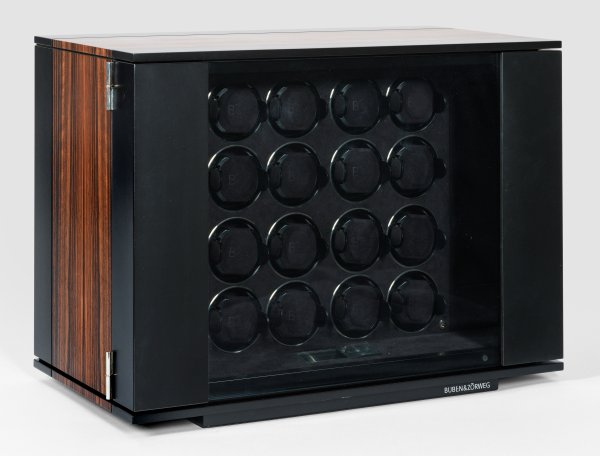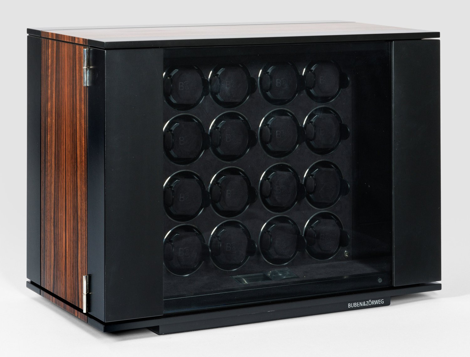 Makassar-Holzkasten, Glastür. Innen Facheinteilung von insges. 16 Uhrenbewegern. Serien-Nr. S7N.C16110001. Original Garantie-Karte. Zubehör: 2 Schlüssel, Paar Handschuhe, Reinigungstuch und Bedienungsanleitung. Nahezu Neuwertig. 42 cm x 56 cm x 28 cm. Neupreis ca. € 10.000,-.